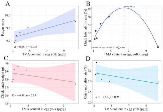 In contrast, no significant correlations were found between TMA contents and chick hatch weight (R = −0.48, p = 0.33) or mortality during brooding (R = −0.56, p = 0.25; Figure 4C,D), although an overall trend toward reduced mortality at higher TMA contents was observed.