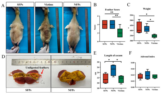 The physical characteristics of the gosling classification. N = 30. (A) Three categories of FP goslings: severe feather peckers (SFPs), victims of SFP (victims), and non-peckers (NFPs). (B) Feather scores. (C) Body weight. (D) Feather residue from gizzard contents. (E) Length of the cecum. (F) Adrenal index. * p < 0.05, ** p < 0.01.