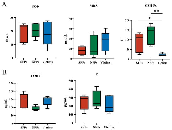 As depicted in Figure 2A, the victim group exhibited a significant reduction in GSH-Px levels compared to both the SFP and NFP groups (p < 0.05). In contrast, no significant differences were observed in MDA or SOD levels across the three groups (p > 0.05). The decline in GSH-Px levels within the victim group may indicate a reduced antioxidant capacity, which could potentially impair immune cell function and overall immune status.