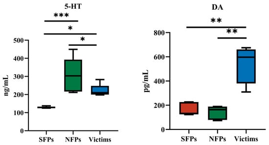 Detection of 5-HT and DA in serum. * p < 0.05, ** p < 0.01, *** p < 0.001.