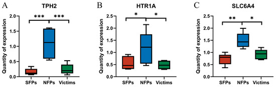 Differential expression of 5-HT metabolism-related genes ((A) TPH2, (B) HTR1A, and (C) SLC6A4). * p < 0.05, ** p < 0.01, *** p < 0.001.