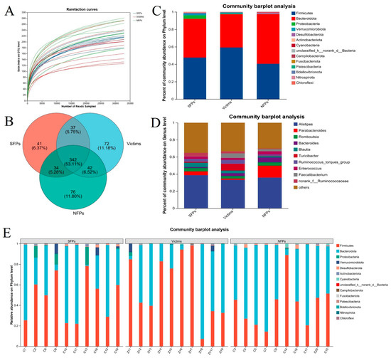 Inter-group variations in alpha diversity indices were meticulously examined, as illustrated in Figure 6A. Highly significant differences were noted between the victim and NFP groups in both the Ace index (p < 0.01) and the Chao index (p < 0.01), and a less significant difference in the Chao index was also detected (p < 0.05). No significant differences were found among the three groups in terms of the Shannon and Simpson indices. Nevertheless, significant differences were identified between the victim and NFP groups for the coverage index and the Sobs index (p < 0.05).
