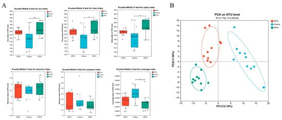 Diversity analysis of gut microbiota in gosling. (A) Gut microbiota alpha diversity index in goslings of SFP, victim, and NFP groups. (B) The principal coordinates (PCA). * p < 0.05, ** p < 0.01.