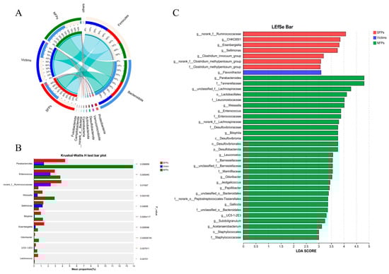 An analysis of the linear discriminant analysis effect size was performed on the gut microbiota of goslings. (A) Circos sample species relationship map demonstrating the distribution of microbial species present in the microflora of three groups of goslings. (B) Bacterial composition comparisons among the groups on phylum level (Kruskal–Wallis H test). (C) LDA scores (LDA > 3) of taxonomic units showing differences in the abundance of SFPs, victims, and NFPs. Red, blue, and green bars correspond to taxonomic units enriched in SFPs, victims, and NFPs, respectively. * p < 0.05, ** p < 0.01, *** p < 0.001.