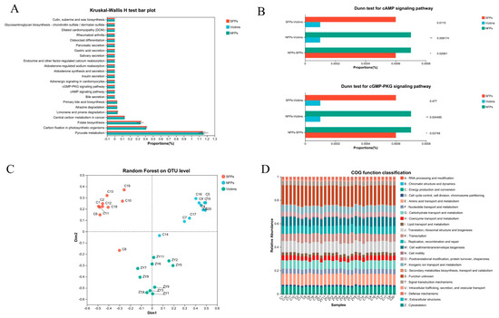 To infer the functional potential of microbial communities, we utilized PICRUSt2 to characterize the functional profiles of the gut microbiota in goslings. The analysis revealed a significant enrichment of the cAMP signaling pathway, cGMP–PKG signaling pathway, and pyruvate metabolism, as shown in Figure 8A,B. Notably, the cAMP signaling pathway activates protein kinase A (PKA), which modulates the release of neurotransmitters like DA and 5-HT, thus playing a crucial part in the regulation of emotions and behaviors. Moreover, stress or stressful situations can activate these signaling pathways, consequently influencing neuronal metabolism and activity and potentially giving rise to the abnormal behaviors witnessed in goslings. Random forest analysis further revealed distinct clustering patterns among the sample groups, highlighting pronounced inter-group variability (Figure 8C). Additionally, bar charts were employed to illustrate the proportion of COG functional categories across different samples, as displayed in Figure 8D.