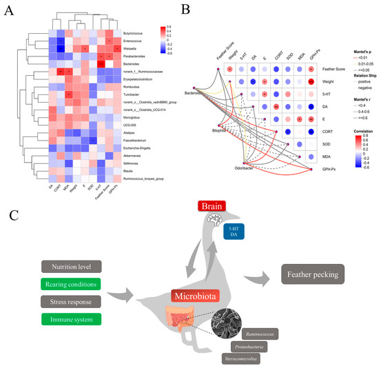 Correlation between gut flora genus, feather score, physiological indices, and antioxidant capacity. (A) Spearman correlation coefficients of the correlation between gut flora genus, feather score, physiological indices, and antioxidant capacity with different bacterial genera. (B) Correlation between feather score, physiological indices, and antioxidant capacity with Bacteroides, Bilophila, and Odoribacter. The heatmap shows statistically significant correlation values (r). Red squares indicate significant positive correlation (0 < r ≤ 1), white squares indicate no correlation (r = 0), and blue squares indicate significant negative correlation (1 ≤ r < 0); darker colors indicate greater correlation. * p < 0.05, ** p < 0.01, *** p < 0.001. (C) Schematic diagram of the gut microbiota–antioxidant indicators–hormone axis.