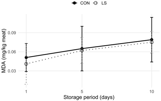 To evaluate lipid oxidation induced by refrigerated storage, malondialdehyde (MDA) concentrations were measured using the method described by Ahn et al. [31]. Samples were vacuum-packed and stored in a refrigerator at 4 °C. Analyses were conducted on Days 1, 5, and 10 of storage. MDA concentrations were determined by comparing sample absorbance to a standard curve prepared with known concentrations of MDA and were expressed as mg/kg of meat.