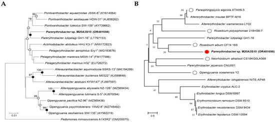 Genomic DNA was extracted using the Exgene DNA extraction kit (GeneAll, Seoul, Republic of Korea), following the manufacturer’s protocol. The 16S rRNA gene was amplified using bacteria-specific universal primers 27F and 1492R, and sequenced using an automated sequencer (ABI 3730XL, Applied Biosystems, Foster City, CA, USA) at Macrogen Co., Ltd. (Seoul, Republic of Korea) as previously described [17]. The obtained sequences were assembled with Geneious v9.0.5 to yield a nearly full-length 16S rRNA gene sequence. For taxonomic identification, the 16S rRNA gene sequence (1494 bp) of Parerythrobacter sp. M20A3S10 was analyzed using the EzBioCloud server (https://www.ezbiocloud.net/identify, accessed on 30 March 2022) and compared with validated type strains (Figure 1A). The sequence has been deposited in GenBank under the accession number OR481698.