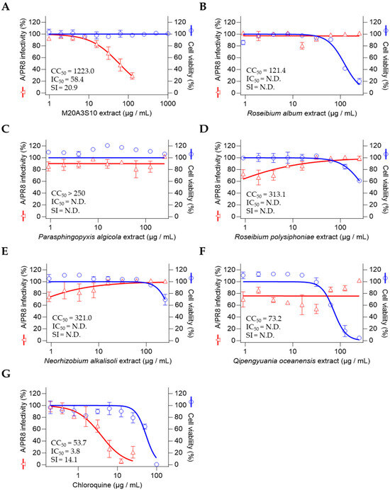 So, antiviral screening was conducted on strain M20A3S10 and five other selected bacteria through the determination of the IC50 of the extracts and was measured by quantitative cytopathic effect (CPE) reduction in A/PR8 strain-infected cells (0.1 MOI) (Figure 2). As a result, the extract of Parerythrobacter sp. M20A3S10 (M20A3S10 extract) showed the most significant antiviral activity against A/PR8 infection (CC50 = 1223 µg/mL, IC50 = 58.4 µg/mL, SI = 20.9), which is greater than chloroquine (CC50 = 53.7 µg/mL, IC50 = 3.8 µg/mL, SI = 14.1), an FDA-approved antiviral drug [27].