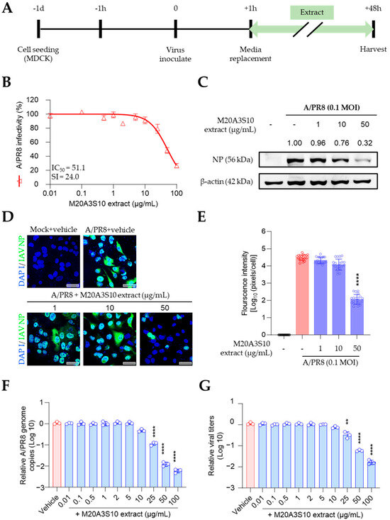 Therefore, the antiviral mechanism was further studied using post-treatment of the extract (Figure 3A). As shown in Figure 2, influenza virus-induced CPE was dramatically decreased by the M20A3S10 extract with no observed cytotoxicity, exhibiting a great therapeutic index (CC50 = 1223 µg/mL, IC50 = 51.1 µg/mL, SI = 24.0) (Figure 3B). In addition, IFA and Western blot revealed that the treatment suppressed virus protein synthesis in a dose-dependent manner (Figure 3C–E). According to RT-qPCR and TCID50, a gradual antiviral activity was found toward higher concentrations, resulting in significant reductions in viral genome synthesis as well as infectious virus particles (Figure 3F,G).