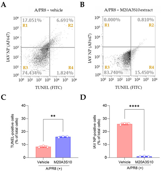 Evaluation of apoptotic response by M20A3S10 extract using flow cytometry. Apoptosis was assessed using the TUNEL assay, and viral protein expression was detected with an antibody against IAV NP. (A,B) Flow cytometry plots: The x-axis represents the fluorescence intensity of the FITC-conjugated TUNEL signal (Ex: 485 nm, Em: 528 nm), and the y-axis represents the fluorescence intensity of the AF647-conjugated anti-NP antibody (Ex: 650 nm, Em: 665 nm). (A) A/PR8-infected (0.1 MOI), vehicle-treated group. (B) A/PR8-infected (0.1 MOI), M20A3S10 extract-treated group. (C,D) Quantification of TUNEL-positive cells (C) and IAV NP-positive cells (D) in the vehicle- and extract-treated groups. **, p < 0.01; ****, p < 0.0001. R1: NP+/TUNEL− cells; R2: NP+/TUNEL+ cells; R3: NP−/TUNEL− cells; R4: NP−/TUNEL+ cells.