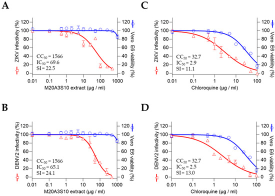 Antiviral activity against flaviviruses by full treatment of M20A3S10 extract. Antiviral actions were measured against ZIKV (A,B) and DENV2 (C,D) infections, treated with either the M20A3S10 extract or chloroquine.