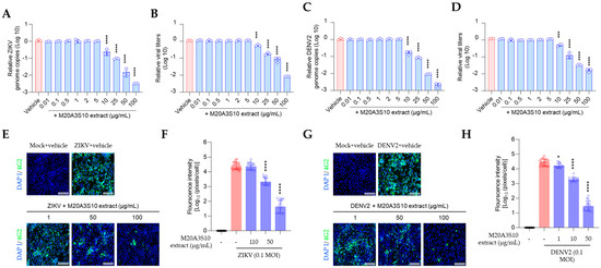M20A3S10 extract efficiently suppressed flavivirus infections. (A,B) Genome replication (A) and progeny virus production (B) were inhibited by the extract in ZIKV infection. (C,D) Genome replication (C) and progeny virus production (D) were inhibited by the extract in DENV2 infection. (E,F) The extract inhibited the viral protein synthesis (E) in a dose-dependent manner, which was quantified by calculating the positive signal (F) in ZIKV infection. (G,H) The extract inhibited the viral protein synthesis (G) in a dose-dependent manner, which was quantified by calculating the positive signal (H) in DENV2 infection. *, p < 0.05; ***, p < 0.001; ****, p < 0.0001.