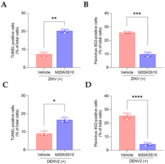 Evaluation of apoptotic response by M20A3S10 extract using flow cytometry. Apoptosis was measured by TUNEL assay and virus protein by an antibody against flavivirus group envelope protein, respectively. (A–D) Summary of flow cytometry data. Quantification of TUNEL (A,C) and virus-positive cells (B,D) treated with the vehicle or M20A3S10 extract. All data in the graphs are presented as the arithmetic mean ± S.D. from three independent experiments. *, p < 0.05; **, p < 0.01; ***, p < 0.001; ****, p < 0.0001.