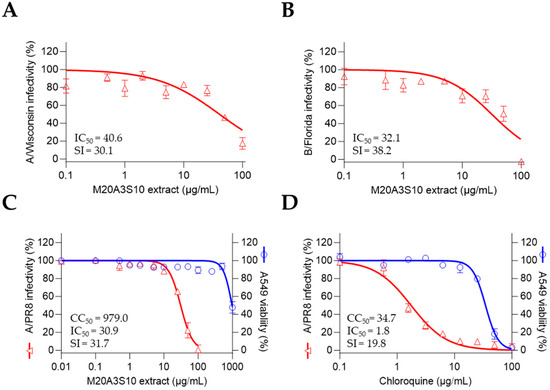 The post-treatment of the M20A3S10 extract shows a broad spectrum of antiviral potential against multiple influenza viruses. (A,B) Antiviral actions were measured against the A/Wisconsin strain (A) and the B/Florida strain (B). (C,D) Antiviral responses in A549 cells by the post-treatment of M20A3S10 extract (C) and chloroquine (D).