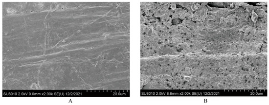 Scanning electron microscopy images (scale bar = 20 μm) of rape straw in treatments without (i.e., control, (A)) or with mixed ensiling (i.e., mixed silage, (B)). Control, a mixture of rape straw and whole crop corn silage; Mixed silage, mixed silage of rape straw and whole crop corn.