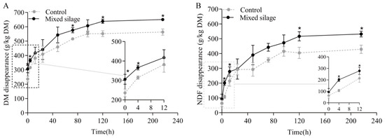 In the present study, mixed silage had distinct kinetics of DM or NDF disappearance compared to those of the control, and exhibited greater (p ≤ 0.05) DM or NDF disappearance at the incubation times of 4, 120 and 216 h than the control (Figure 2).