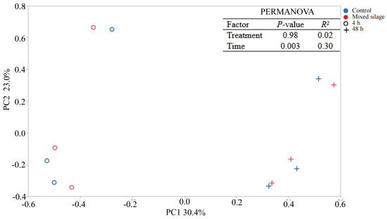 Principal coordinate analysis (PCoA) of bacterial community attached to control and mixed silage at 4-h and 48-h incubation. Control, a mixture of rape straw and whole crop corn silage; Mixed silage, mixed silage of rape straw and whole crop corn.