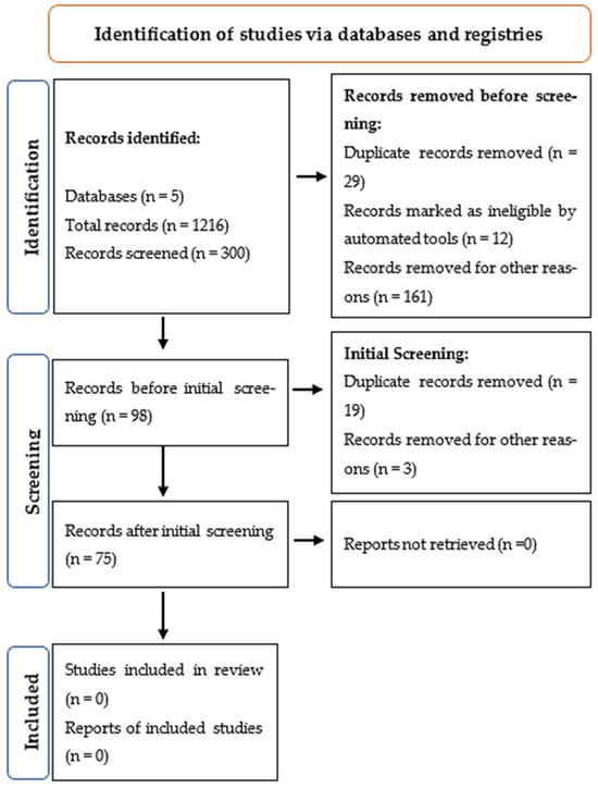 Articles from academic databases were analyzed for the period between 1 January 2019 and 31 July 2024. The databases provided a total of 1216 articles, from which 300 were selected for initial analysis. Of these, 98 articles met the inclusion criteria and were classified into the defined thematic groups in the first screening. After a second screening, 22 articles were excluded, resulting in 75 articles that were analyzed in the systematic review. The PRISMA flow diagram, presented in Figure 1, details the bibliographic research aspects carried out for this systematic review.