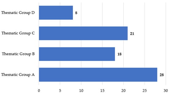 Of the researched articles, 37% fit into thematic group A (animal identification and monitoring), 24% fit into thematic group B (human–animal relationships in swine farming), 28% fit into thematic group C (Animal welfare), and 11% fit into thematic group D (productive and economic management), as shown in Figure 2.