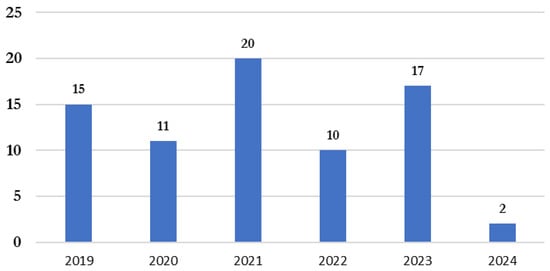 The number of publications per year was as follows: in 2019, 15 articles were published; in 2020, 11 articles; in 2021, 20 articles; in 2022, 10 articles; in 2023, 17 articles; and in 2024, 2 articles were reviewed (Figure 3).
