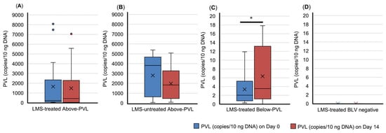 Dynamics of bovine leukemia virus provirus load (PVL) in blood. (A) LMS-treated Above-PVL group; (B) LMS-untreated Above-PVL group; (C) LMS-treated Below-PVL groups; (D) LMS-treated BLV-negative group. Blue box: PVL (copies/10 ng DNA) on Day 0. Red box: PVL (copies/10 ng DNA) on Day 14. Abbreviation: LMS, levamisole. Above-PVL: group with PVL above the cut-off value; Below-PVL: group with PVL below the cut-off value. * p < 0.05. The cross sign indicates the mean. The blue and red dots represent outliers.