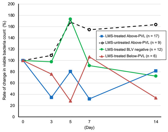 Compared with Day 0, the LMS-treated group above the PVL cut-off value showed a reduction in the viable bacterial count on Days 3, 5, 7, and 14 (Figure 2). By contrast, the LMS-untreated group above the PVL cut-off value showed increases in the viable bacterial count on all these days (Figure 2). In the LMS-treated BLV-negative group, the viable bacterial count transiently increased on Day 5; in the LMS-treated group below the PVL cut-off value, the viable bacterial count transiently increased on Day 7. However, this count decreased on the other days (Figure 2).