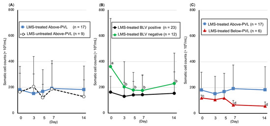 Trends in somatic cell count (SCC, mean ± SD). (A) Above-PVL groups: LMS-treated vs. LMS-untreated; (B) LMS-treated groups: BLV-positive vs. BLV-negative; (C) LMS-treated, BLV-positive groups: Above-PVL vs. Below-PVL. Blue box: PVL (copies/10 ng DNA) on Day 0. Blue line with squares: LMS-treated Above-PVL group (n = 17); Black dotted line with white circles: LMS-untreated Above-PVL group (n = 9); Black line with circles: LMS-treated BLV-positive group (n = 23); Green line with circles: LMS-treated BLV-negative group (n = 12); Red line with triangles: LMS-treated Below-PVL group (n = 6). Abbreviations: LMS, levamisole; PVL, provirus load; BLV, Bovine leukemia virus. Above-PVL: group with PVL above the cut-off value. Below-PVL: group with PVL below the cut-off value. (a–b, c–d: p < 0.05).