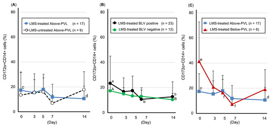 Trends in the number of CD172a-positive/CD14-positive cells (monocytes/macrophages, mean ± SD). (A) Above-PVL groups: LMS-treated vs. LMS-untreated. (B) LMS-treated groups: BLV-positive vs. BLV-negative. (C) LMS-treated, BLV-positive groups: Above-PVL vs. Below-PVL. Blue line with squares: LMS-treated Above-PVL group (n = 17); Black dotted line with white circles: LMS-untreated Above-PVL group (n = 9); Black line with circles: LMS-treated BLV-positive group (n = 23); Green line with circles: LMS-treated BLV-negative group (n = 12); Red line with triangles: LMS-treated Below-PVL group (n = 6). Abbreviations: LMS, levamisole; PVL, provirus load; BLV, Bovine leukemia virus. Above-PVL: group with PVL above the cut-off value. Below-PVL: group with PVL below the cut-off value (a–b, c–d, e–f: p < 0.05; A–B: p < 0.1).