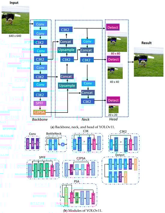 Block diagram of the YOLOv11 model. (a) Functional blocks representing the backbone, neck, and head responsible for extracting, combining, and interpreting features. (b) Detailed view of individual modules.