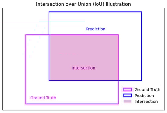 IoU values range from 0 to 1. An IoU of 1 indicates a perfect match between the predicted bounding box and the ground truth box, while an IoU of 0 signifies no overlap at all. In object detection tasks, a prediction is considered a true positive (TP) if its IoU with a ground truth box exceeds a predefined threshold, which is commonly set at 0.5. If the IoU does not exceed this threshold, the prediction is classified as a false positive (FP). Figure 2 provides a graphical representation of how the IoU was calculated.