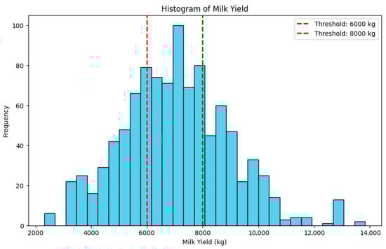 For the classification task addressed in this study, the milk yield distribution of the dataset was analyzed to establish threshold values for categorizing cows into low-, medium-, and high-production classes. Specifically, cows producing less than 6000 kg of milk are labeled as low producers, those producing between 6000 kg and 8000 kg as medium producers, and those exceeding 8000 kg as high producers. The thresholds are determined using a histogram analysis of the milk yield data. As shown in Figure 3, the distribution is right-skewed, with most values ranging between 6000 kg and 8000 kg. The selected cutoffs correspond to the lower and upper quartiles, ensuring both class balance and meaningful separation between yield categories.