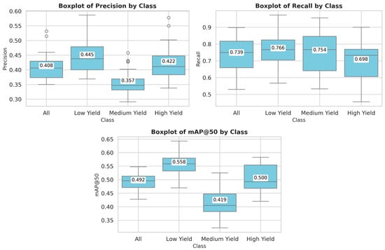 Distribution of precision, recall, mAP@50, and mAP@50–95 across yield categories (all, low, medium, and high yield) over 30 independent training runs.
