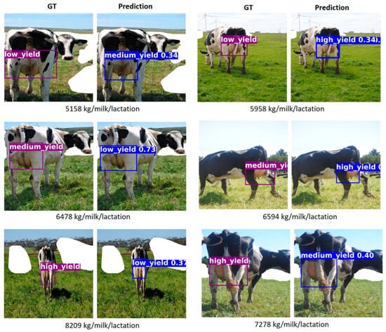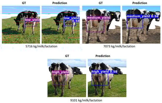 Figure 5 shows qualitative results from a single representative run, illustrating the implemented model’s predictions for different yield classes. Each row includes the ground truth (GT) and the corresponding prediction for a given cow. The actual milk yield is shown below each pair of images. In all three examples, the model correctly classifies the cow into its respective production category.