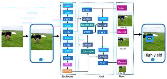The neck of the model combines the feature maps extracted at different scales from the backbone. It uses upsampling operations and feature concatenation to integrate both low-level and high-level information. During this process, C3K2 blocks are interspersed to improve multiscale feature integration. The resulting fused representations are then sent to the head module, which produces the final detection outputs.