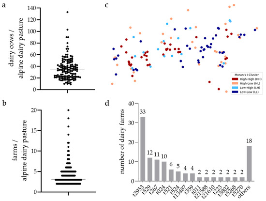 (a,b) Dot plots illustrating the variation in the number of (a) dairy cows and (b) farms per community-based Alpine dairy pasture examined. Each dot represents an individual Alpine dairy pasture; the horizontal line indicates the median value. (c) Local Moran’s I cluster map showing the spatial autocorrelation of S. aureus in community-based Alpine dairy pastures in Tyrol. The colours denote four spatial clusters derived from Local Moran’s I analysis based on similarity or dissimilarity to surrounding points, as follows: High–High clusters (HH, red) indicate hotspots—positive points surrounded by positive points; Low–Low clusters (LL, dark blue) represent coldspots—negative points surrounded by negative points; Low–High (LH, light orange) and High–Low (HL, light blue) show spatial outliers—negative points surrounded by positive points or positive points surrounded by negative points, respectively. (d) Distribution of spa types across surveyed community-based Alpine dairy pastures. Number of pastures where a particular spa type was detected at least once during the season.