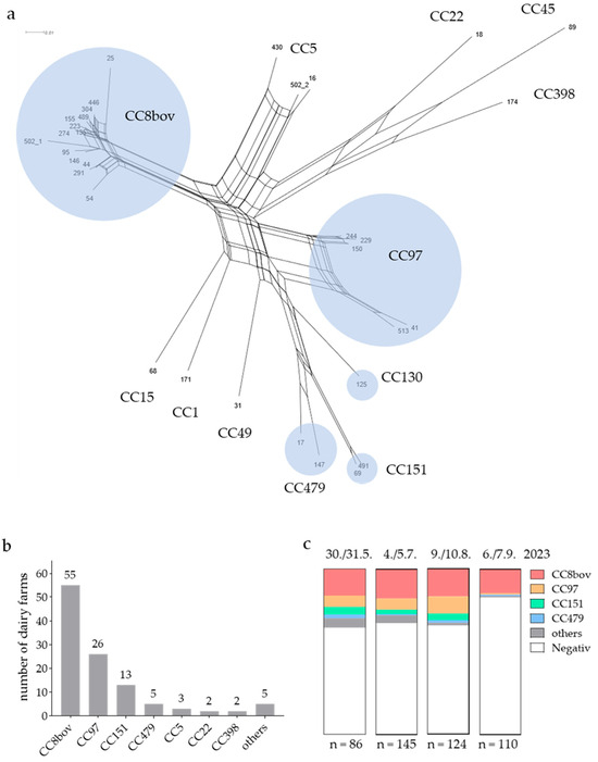 (a) SplitsTree network visualisation showing the genetic relationships among the detected spa types from S. aureus BTM isolates, as determined by DNA microarray hybridisation patterns. Isolates in closer proximity to each other are more closely phylogenetically related, with clustered strains belonging to the same CC. Bovine-associated CCs are highlighted in blue. (b,c) Distribution of CCs across surveyed community-based Alpine dairy pastures. (b) Number pastures where a particular CC was detected at least once during the season. (c) The relative proportion of CCs at four sampling time points between the end of May and the beginning of September 2023. N indicates the number of pastures sampled at a particular sampling time point.