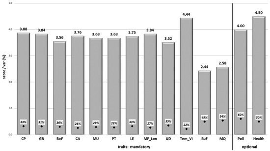 Mandatory and optional trait preference scores 1. 1 Score represents the importance of the trait group in the range: 1—not important, 2—a little, 3—medium (50:50), 4—more important, 5—very important. Var—variation coefficient (%) of the score assigned to traits. CP—calving performance, GR—growth, BoF—body frame, CA—capacity, MU—muscularity, PT—production (breeding) type, LE—legs, MF_Lon—maternal fertility and longevity, UD—udder scoring, TEM_Vi—cow temperament and calf viability, BuF—bull fertility, MQ—meat quality, Poll—polledness, and Health—animal health (for more details, see Table 2).