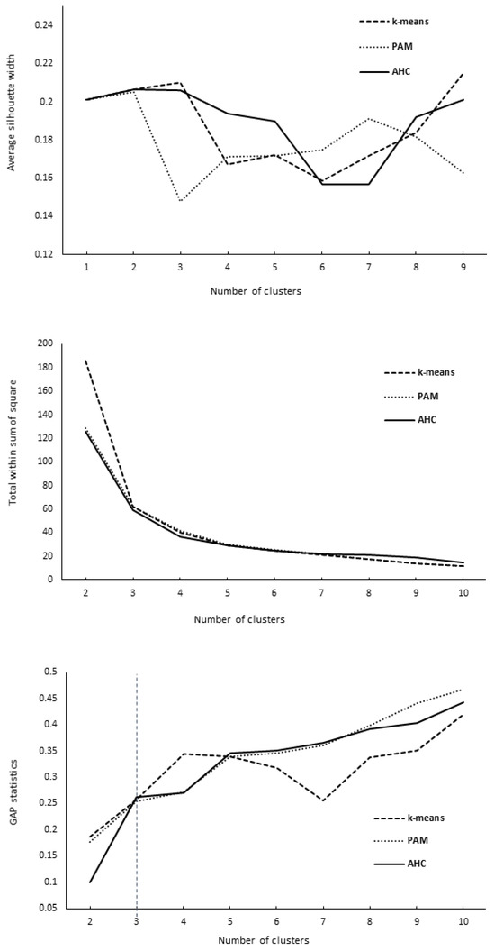 Average silhouette width, total within sum of squares, and gap statistics for the evaluated clustering methods 1. 1 K-means, PAM—partition around medoids, AHC—agglomerative hierarchical clustering. For a detailed description of methods, see the Materials and Methods section.