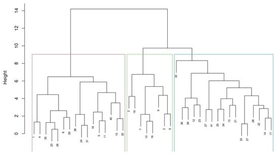 Allocation of herds into three clusters 1. 1 Blocks represent 16 (red), 8 (green), and 17 (blue) herds allocated to clusters 1, 2, and 3, respectively. In total, 41 herds were clustered. The individual herd numbers show the order in which the farmers participated in the survey.