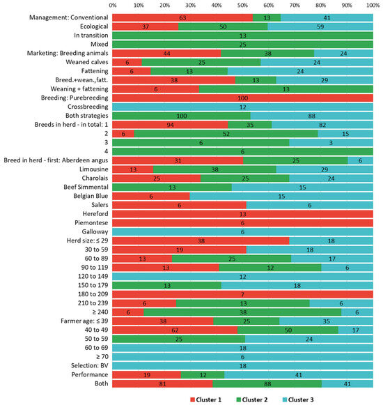 Beef cattle farm characteristics 1 (%) in clusters 1, 2, and 3. 1 More details on farms assigned to clusters and their characteristics can be seen in the Results section and in Figure 3, respectively. The ratio of respective characteristics sums 100% per given cluster and characteristic.