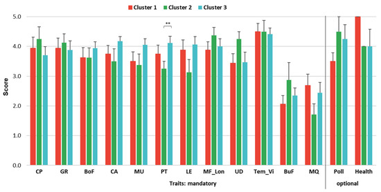 Trait preferences (score) 1 and respective errors in clusters 1, 2, and 3. ** p < 0.05. 1 Cluster-specific score assigned for traits: CP—calving performance, GR—growth, BoF—body frame, CA—capacity, MU—muscularity, PT—production (breeding) type, LE—legs, MF_Lon—maternal fertility and longevity, UD—udder scoring, TEM_Vi—cow temperament and calf viability, BuF—bull fertility, MQ—meat quality, Poll—polledness, and Health—animal health. For more detailed trait descriptions and cluster characteristics, please see Table 2 and Figure 4, respectively.