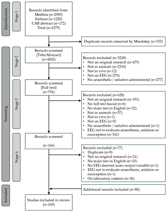 The search terms combined keywords related to EEG, anaesthesia and sedation, and animals. Full search strings are reported in the Supplementary Material (Tables S1–S3). Search results were imported into Mendeley Reference Manager for organisation and management. Duplicates were systematically removed. All references were then transferred to a Microsoft Excel spreadsheet and sorted alphabetically by the first author’s surname. Each reference was identified by the first author’s name, year of publication, ISSN number, and article title to facilitate further screening.