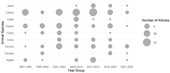 The distribution of animal species investigated over time is shown in Figure 2. The distribution of research articles according to categories of EEG-derived variables (e.g., suppression ratio, power-based variables, frequency-based variables, index, etc.) is presented in Figure 3. (*) One paper reported the use of both porcines and caprines.