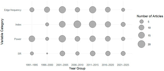 Distribution per categories of research articles investigating the use of EEG-derived quantitative variables to evaluate depth of anaesthesia over the years (publication date). Edge frequency: Articles reporting on the use of the dominant EEG frequency to evaluate DoA; Index: Articles reporting on the use of an EEG Index of DoA; Power: Articles reporting on the use of the EEG power to evaluate DoA; SR: Articles reporting on the use of the EEG suppression ratio to evaluate DoA.