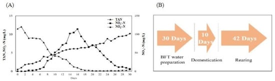 Nitrogen component variations of the BFT inoculating period (A) and total experimental process and days (Arrow indicate the order of the experiment. First, 30 days; BFT water preparation, Second, 10 days; Domestication, Final, 42 days; Rearing) (B).