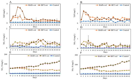 Water quality variations of BAPs, BFT, and FTS systems containing catfish and eel for 6 weeks ((A,C,E) for catfish, (B,D,F) for eel).