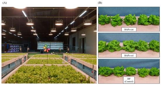 The crop cultivation systems were divided into three types (BAPs-catfish, BAPs-eel, and HP). Each type included triplicate setups. All crop beds were subjected to DWC and comprised 90 pots per bed to cultivate the crops and a coupled system, as described by []. Artificial lighting was installed for indoor crop cultivation, and the 12 L:12 D conditions adopted >6000 lx (daily average) for photosynthesis. HP was conducted as a control for crop cultivation and commercial artificial nutrient solutions (Liquid A: N 2%, K 3.5%, Ca 2%, Fe 0.05%; Liquid B: 1.3%, P 1.5%, K, 5%, Mg 0.7%, B 0.05%, Mn 0.01%, Zn 0.002%) (Mulfuresiriz, Daeyu Business Limited, Seoul, Republic of Korea) were used at 1000 ppm by manual.