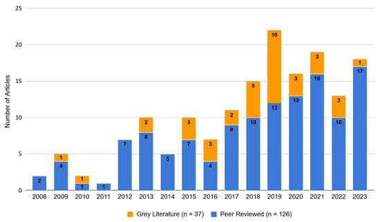 Our initial literature search returned 152 articles. We excluded five articles published outside our specified date range and a further 10 that we were unable to access via academic institutional logins or open-access hosts. The remaining dataset comprised 125 peer-reviewed literature sources (113 journal articles and 12 book chapters) and 12 grey literature sources (four postgraduate theses, three non-peer-reviewed journal articles, three institutional reports, one media article, and one blog post). Our snowball search yielded one peer-reviewed IUCN assessment and 25 grey literature sources (comprising five media articles, two National Assembly questions, one court case summary, three government reports, one postgraduate thesis, one blog, 12 institutional reports, and one peer-reviewed IUCN assessment). All sources are listed in Appendix A.2. Figure 1 shows the number of articles of each source type published over the study period of 2008–August 2023.