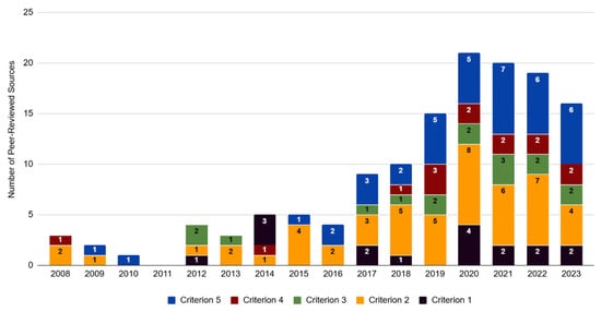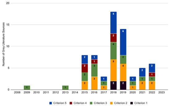 Across the grey literature dataset (n = 37), 73% (n = 27) of the articles contained text relating to at least one of the five criteria in Table 1. The highest number of articles were recorded for criteria 2, 3, and 5 (54%, n = 20; 46%, n = 17; and 54%, n = 20, respectively) (Figure 4). A smaller number of articles contained text relating to criterion 1 (11%, n = 4) or criterion 4 (16%, n = 6). Again, for the grey literature dataset, the majority were published since 2017 (73%, n = 27).